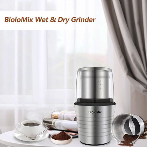 BioloMix 2-in-1 Wet and Dry Double Cups 300W Electric Spices and Coffee Bean Grinder Stainless Steel Body and Miller Blades
