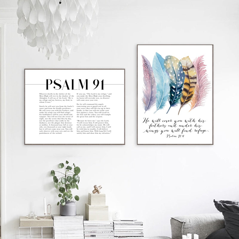 Bible Verse Psalm 91:4 Poster Canvas Art Prints , Birds Feathers Scripture Christian Quotes Canvas Painting Wall Art Home Decor